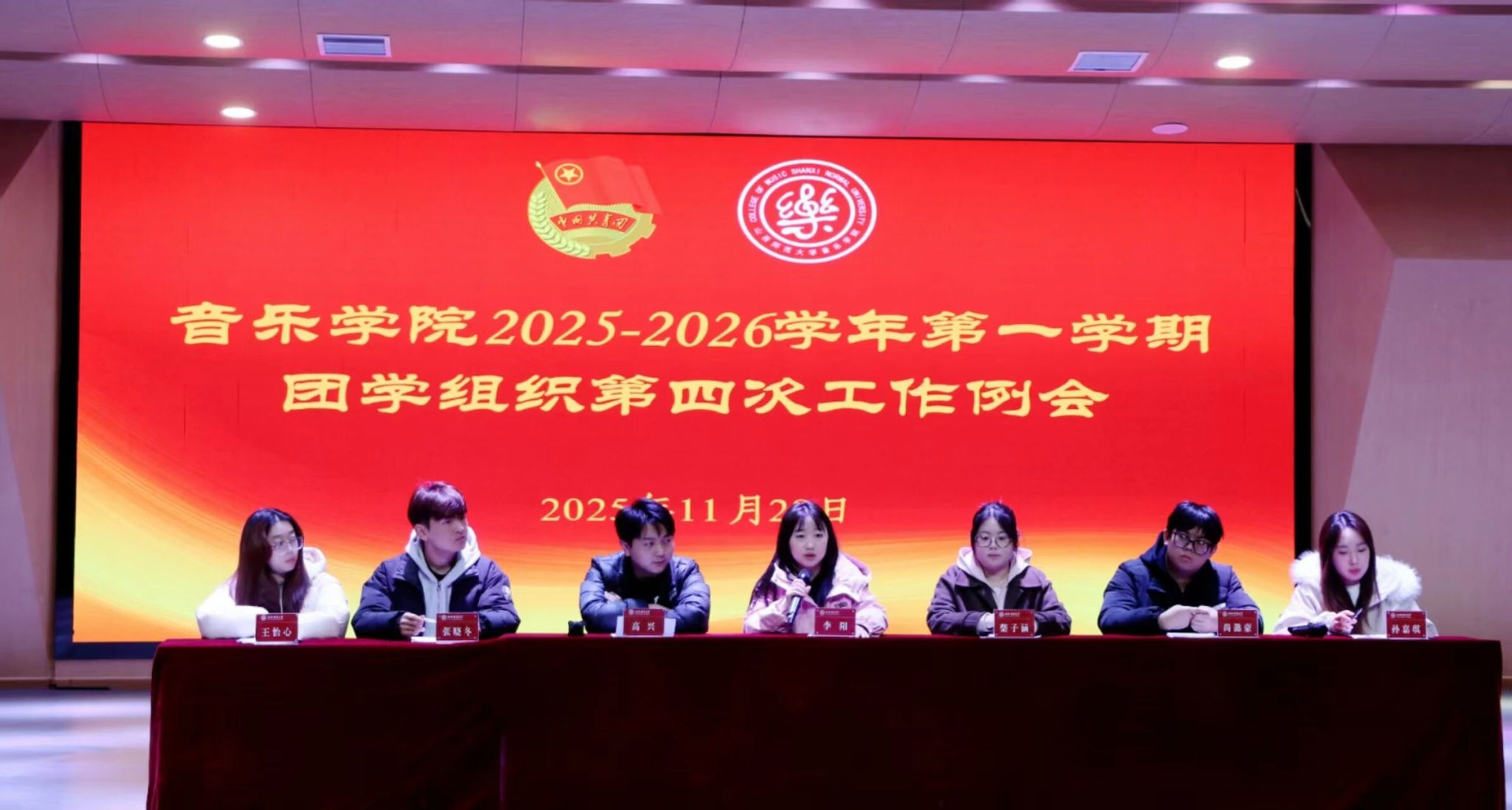 为进一步夯团学组织工作基础,明确工作方向,激发学生骨干责任担当,推动学院学生工作提质增效、创新发展,11月28日中午,音乐学院于音乐舞蹈综合楼音乐厅顺利召开2025-2026学年第一学期团学组织第一次工作部署会。本次会议由学生会主席团成员高兴主持,音乐学院团委书记李阳老师及各部门全体成员参会。